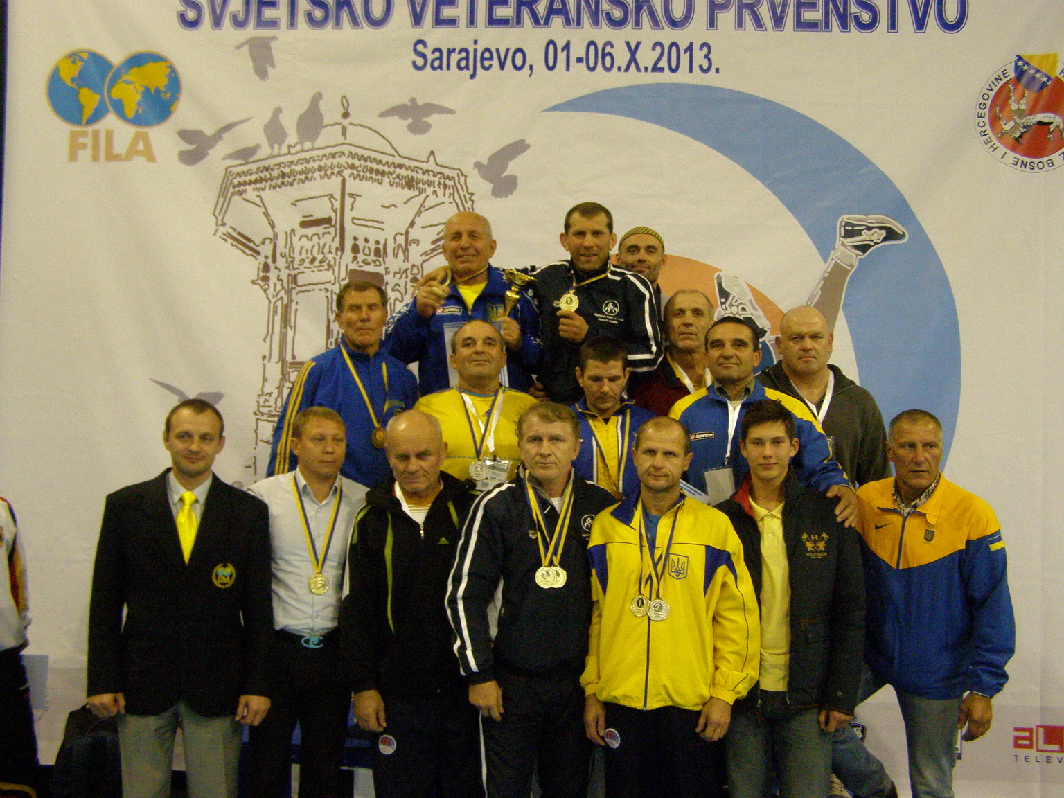 З 1 по 6 жовтня цього року в місті Сараєво (Боснія та Герцеговина) відбувся ХV Чемпіонат світу серед ветеранів з вільної та греко-римської боротьби. Чемпіонат з греко-римської боротьби цього року зібрав біля 300 спортсменів з 33 країн світу віком від 35 до 70 років. Україна була представлена на Чемпіонаті 20 спортсменами з різних регіонів нашої країни. Серед них найбільш досвідчені: п’ятиразовий чемпіон світу, завідувач кафедри фізичного виховання Університету «Україна» Адирхаєв Сослан з Києва.; президент Волинської обласної федерації греко-римської боротьби, чотириразовий чемпіон світу Михайло Нилипюк з Луцька; чемпіони світу – Лев Воронін з Києва; Євген Васильєв з Харкова; Петро Антончук з Луганська; Віктор Смирнов з Вінниці; неодноразові призери чемпіонатів світу Володимир Оглоблін та Валентин Черевишний з Кривого Рогу; Ігор Корольков та Максим Сулімов з Черкас; викладач фізичного виховання Борис Ковтун з Дніпропетровська; Володимир Зубченко з Луганська та інші. Найбільша кількість представників на цьому чемпіонаті була від збірної команди Росії. Змагання проводилися за дивізіонами відповідно віку учасників. За підсумками змагань збірна команда України виступила найбільш вдало за всі роки участі у змаганнях цього рівня. Українські ветерани вибороли шість перших місць, п’ять других та три третіх місця. Дивізіон А – вік спортсменів 35 – 40 років. В даному віковому дивізіоні взяли участь два представника України. У ваговій категорії 58 кг. Україну представляв Черняков Сергій з Кривого Рогу. В першому колі він переміг турецького спортсмена Е.Базара у першому періоді з рахунком 7 – 0. Однак, у другій сутичці він програв майбутньому чемпіону французу Г. Булігі з таким же рахунком і залишився на третьому місці в загальному заліку. У ваговій категорії 85 кг Україну представляв харківчанин, чемпіон світу минулого року Васильєв Євген. Євген впевнено переміг всіх суперників (росіянина Ю. Бурзіна та турка Б.Караманлі) та виборов перше місце. Дивізіон В – вік спортсменів 41 – 45 років. Вагова категорія 63 кг була представлена чемпіоном світу 2011 року Смирновим Віктором з Вінниччини. Він впевнено провів всі свої сутички, перемігші по черзі казаха Н.Норбекова у першому періоді (8-0), норвежця Г.Ларсена (туше ) та латвійця Сувітра А. (4-0) виборов перше місце. У ваговій категорії 85 кг. брав участь Бабкін Юрій з Луганська. Програв в першому колі турецькому спортсмену І.Ільмазу в напруженій боротьбі (0-6) він вибув з подальших змагань і посів 12 місце. В дивізіоні С (вік спортсменів 46 – 50 років) у ваговій категорії 85 кг. брав участь Ложечка Олексій з Луганська. Програв в першому колі німцю Р. Шухбоеку в напруженій боротьбі (0-6) він вибув з подальших змагань і посів 7 місце. У ваговій категорії 97 кг. срібну медаль для збірної команди України виборов Володимир Оглоблін. В першому колі він не зміг подолати естонського спортсмена А.Успенські (2-0, 1-0). В другому, переміг ще одного естонця Т. Сейтона, а у третьому колі переміг німецького борця Ш.Рачвальски. В найважчий ваговій категорії дивізіону С – 130 кг Україну представляв чемпіон світу 2010 року Лев Воронін. В перших двох сутичках він поклав на лопатки почергово Р. Ізмаілханлі з Азербайджану та А. Майера з Німеччини. У фіналі Вороніну протистояв потужний турецький спортсмен О.Кастан. В напруженій боротьбі переміг туре