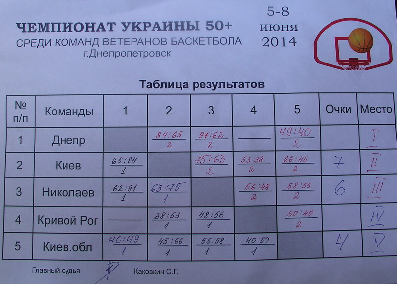 Осталась последняя игра кругового чемпионата с командой Киева – выигрыш выводил АMICO на второе место. 8.06.14. 10-00. Первый период. Пошла игра у николаевской команды и результат был весьма оптимистичен 20 : 9. Киевляне заиграли активней, прессингуя по всему полю и счет после третьего периода выровнялся 42 : 42. В четвертом периоде на взлете киевляне продолжили наступление и полностью переиграли николаевцев 23 : 11. Победа ветеранов Киева 75 : 63. У лидеров-бомбардиров команд А.Бережинского и Ю.Косенко соревнование между собой выиграл А.Бережинский – 29 очков, у Ю.Косенко – 27 очков.