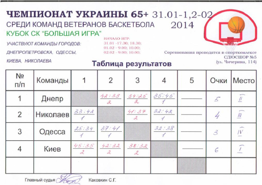 Впервые в истории ветеранского баскетбола Украины в Днепропетровске в спорткомплексе СДЮСШОР №5 прошел Чемпионат Украины, Кубок СК «Большая Игра» среди команд ветеранов баскетбола в возрастной категории 65+. Все три игровых дня на спортплощадке шла интересная и азартная борьба сборных команд Киева, Николаева, Одессы и Днепропетровска.