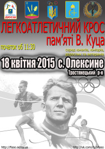 18 квітня (у суботу) в селі Олексине Тростянецького району відбудуться змагання відкритого чемпіонату області з легкоатлетичного кросу пам’яті дворазового Олімпійського чемпіона В.Куца. До участі в змаганнях запрошуються всі бажаючі без вікових обмежень. Перша вікова категорія учасників – 2003 р.н. і молодше. Більше інформації дізнавайтесь у регламенті проведення цих змагань. Із радістю запрошуємо до участі спортсменів з інших міст та областей.