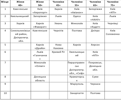 У першу зміну змагалися чоловіки вікової групи 40+, 50+, 60+, 70+ і жінки 35+, 45+, 55+, у другу – чоловіки: 45+, 55+, 65+, 75+, жінки: 40+ та 50+.