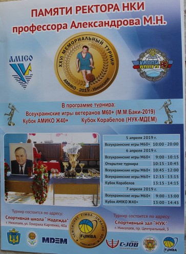 З 5 по 7 квітня 2019 року в рамках 26-го турніру пам’яті ректора Миколаївського кораблебудівного інституту професора М.Н.Александрова пройшли фінальні змагання VIII літніх Всеукраїнських ігор ветеранів спорту пам’яті М.М.Баки з баскетболу в віковой категорії 60+.